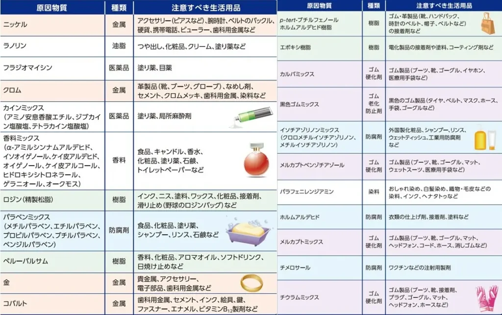 現代社会では通常生活で繰り返し 種々のアレルゲンが皮膚から吸収される機会があります。 いつまでも、皮膚の赤みが続いたり、茶色く変色したり、 治療をしているのに治らない時には身近に原因があるかもしれないと 考えることも必要で、悪化原因となっているアレルゲンを見つけることが大切です。