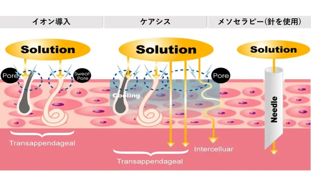数あるエレクトロポレーション機械の中でも、ケアシスは特別な機械になります。 ケアシスは45℃から-20℃まで調節しながら、 有効成分を導入できる「クライオエレクトロポレーションシステム」を 採用しています。 従来のエレクトロポレーションと比べ、冷却を加えることで血管が収縮し、 導入した薬剤が皮膚に長時間とどまるため効果をさらに発揮できます。