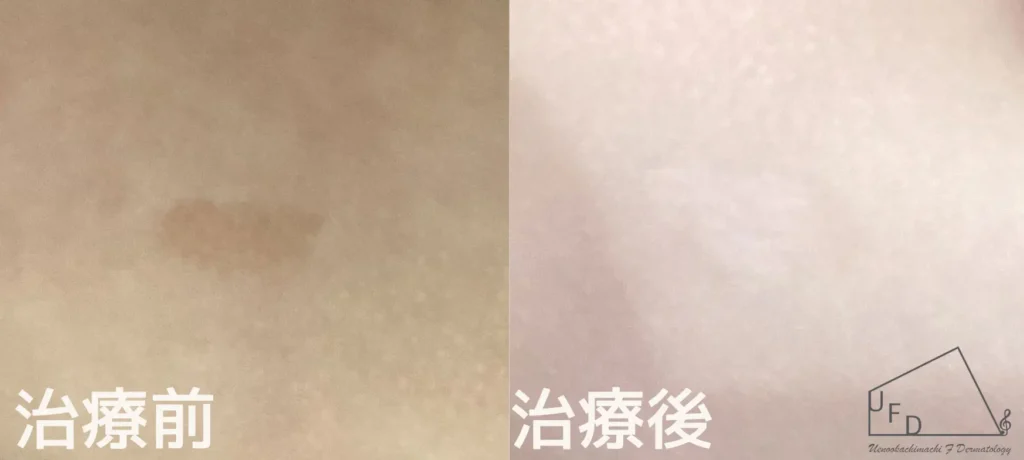 このようにすべての扁平母斑がレーザーで薄くなるわけではないため、大きい扁平母斑では一部を試験的にレーザー照射しその反応をみて、薄くなるようでしたらその後全体にレーザー治療をすることもあります。小さい扁平母斑であれば、最初から全体をレーザー治療することもあります。ご希望も聞きながら治療を進めていきますのでお気軽にご相談ください。