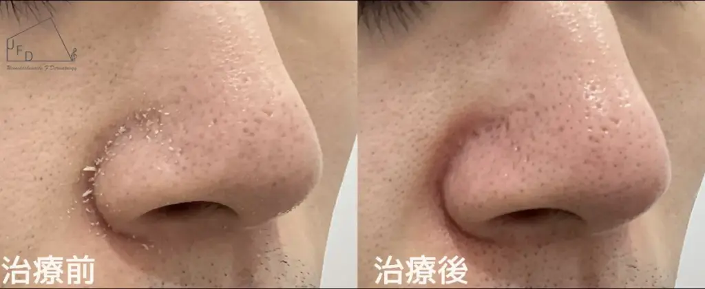 鼻の黒ずみが気になり受診されました。ハイドラフェイシャルを1回行い、肌にツヤがでて黒ずみもよくなっています。