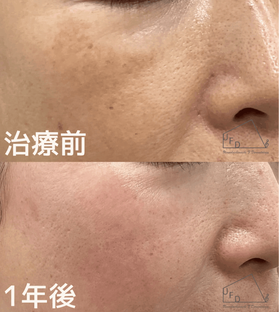 なかなか治らない肝斑で当院を受診されました。ナノハイドロキノンとナノトレチノインをホームケアで行い、ケアシスSによるレナトスTaプラス(トラネキサム酸)導入を8回行い肝斑が薄くなり、肌のトーンが明るくなっています。