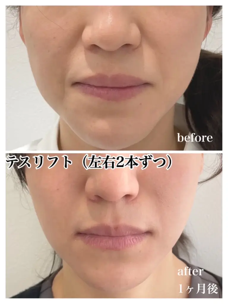 短いダウンタイムがご希望でしたので、ほうれい線とフェイスラインに対して片側テスリフトソフト2本とアンカーリフト1本を行いました。フェイスラインがすっきりし、口横のたるみも改善しています。