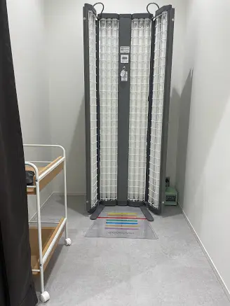顔以外を当てることも可能です。全身型ナローバンドUVBで行う場合は紫外線をカットできるタオルなどで顔を覆います。ご自宅からタオルを持参される方もいらっしゃいます。